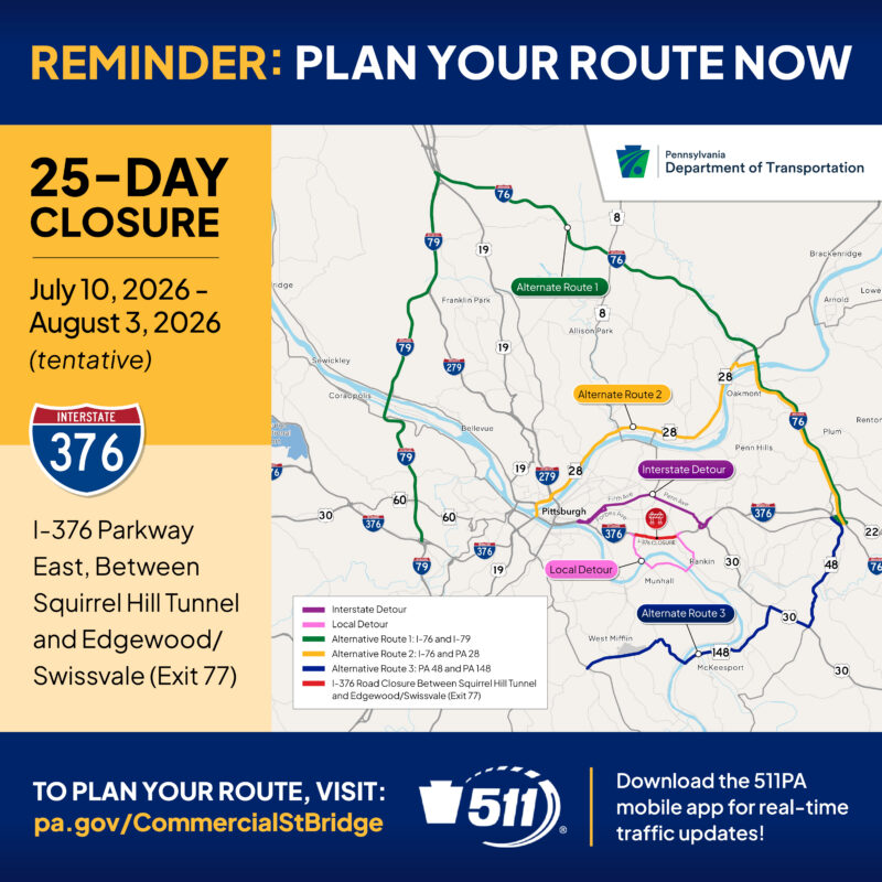 - For project updates or sign up for Parkway East alerts: pa.gov/CommercialStBridge